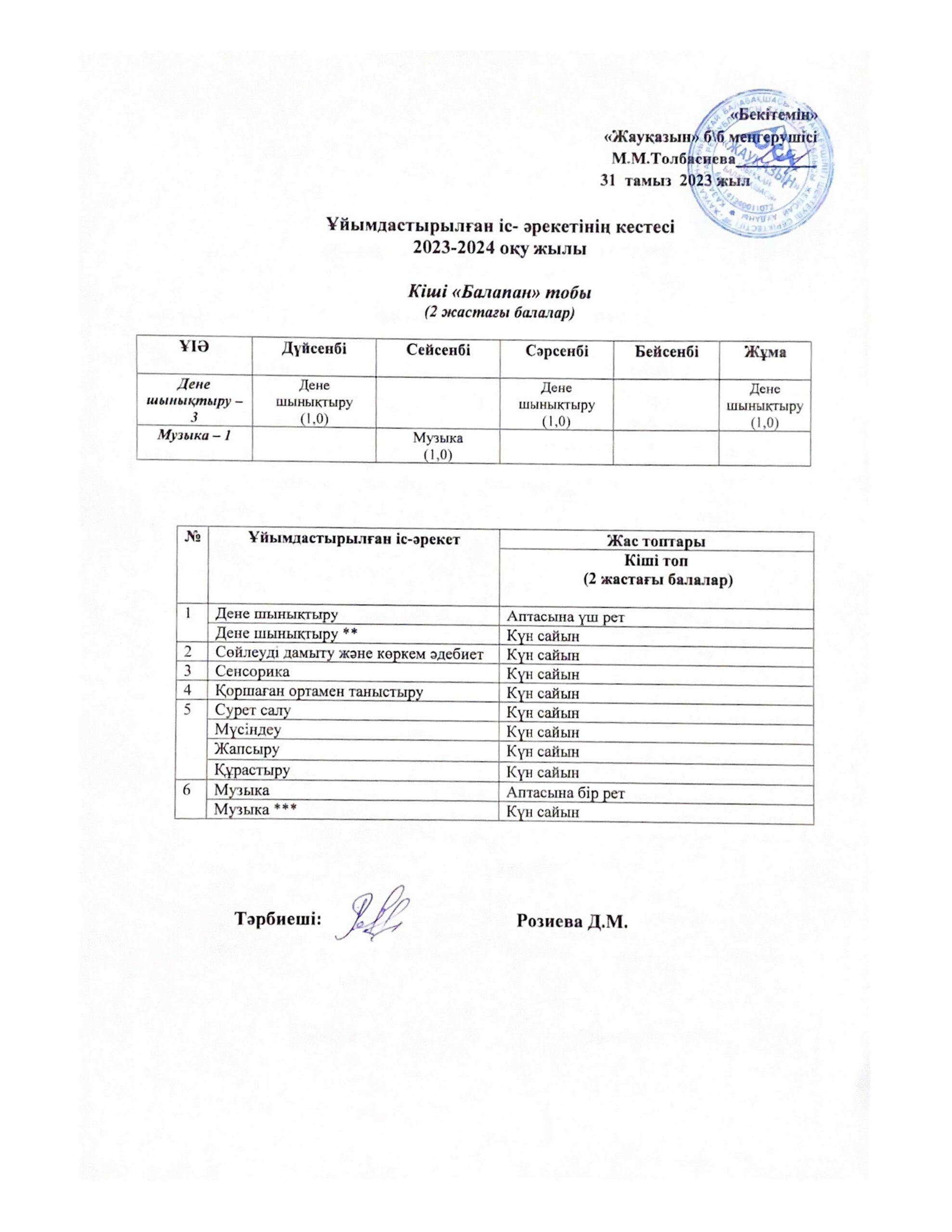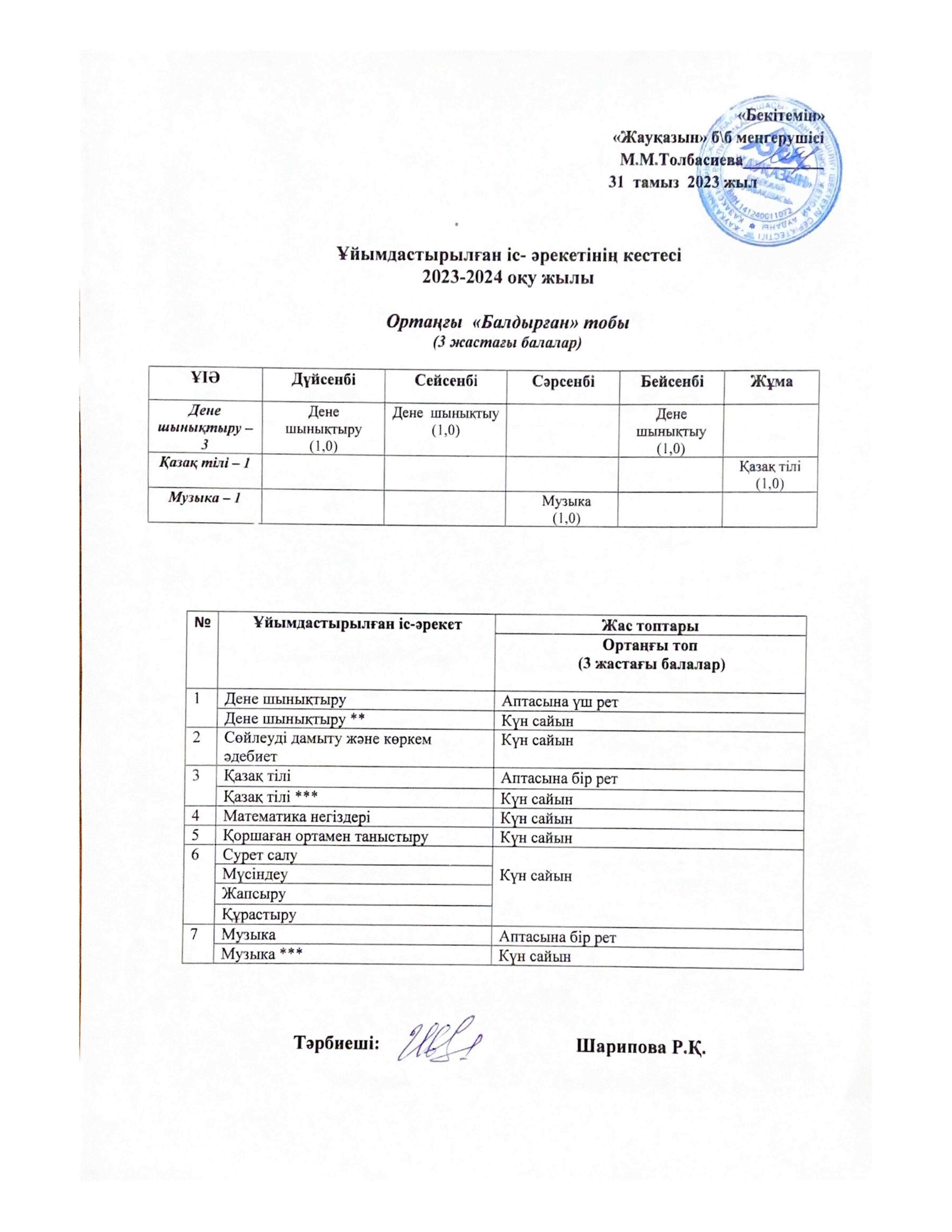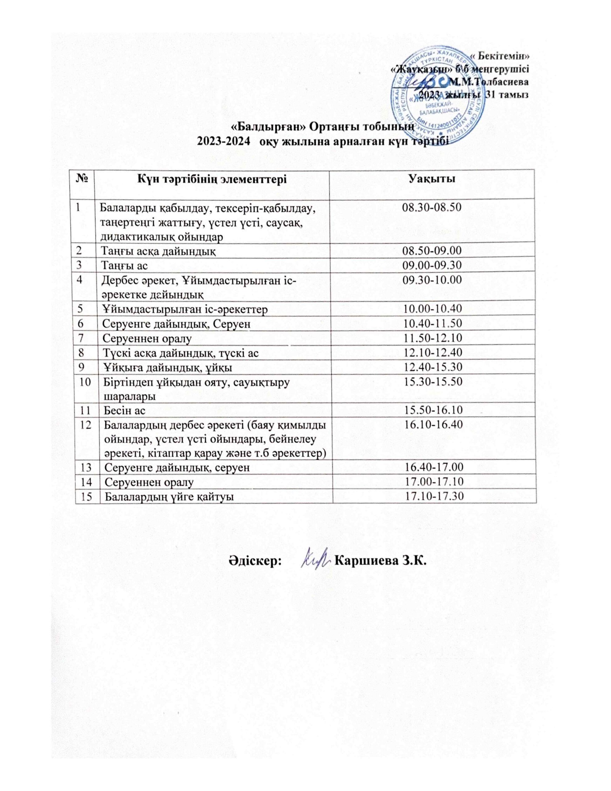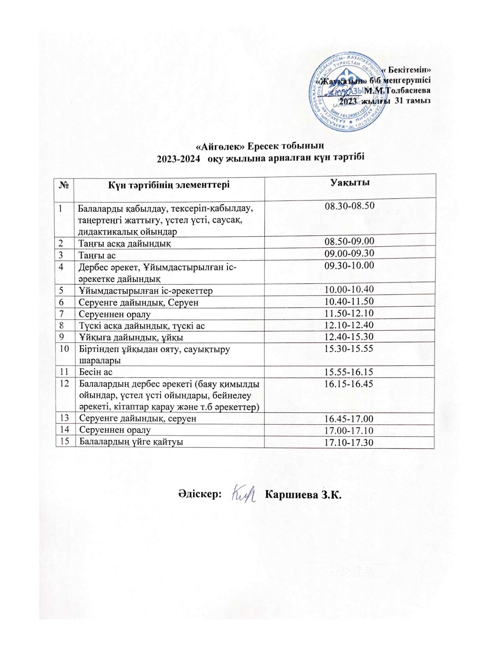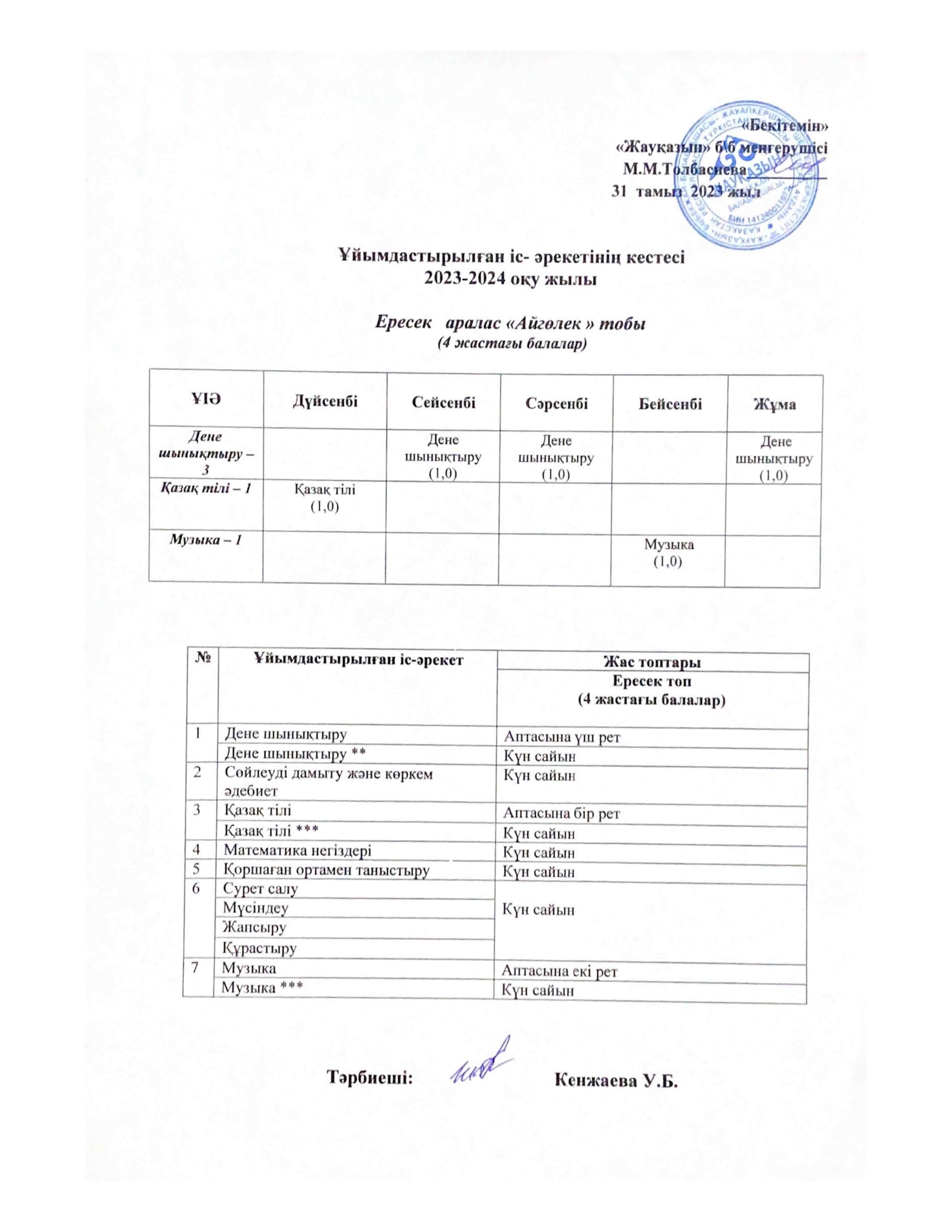 Күн тәртібі, оқу іс-әрекет кестесі